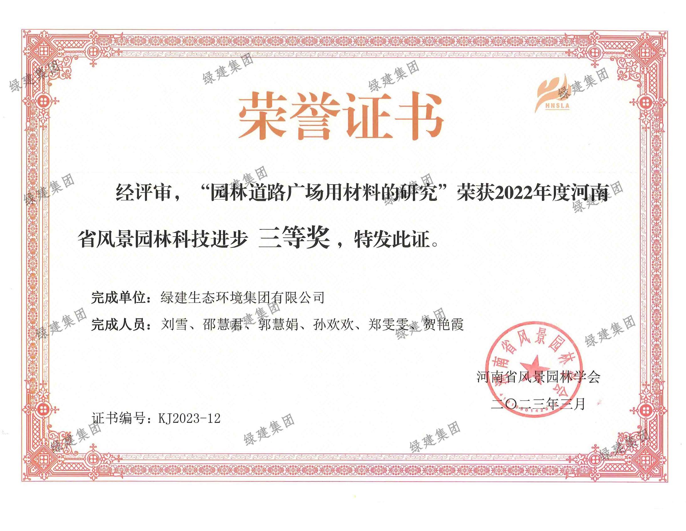 2023年度河南省風(fēng)景園林科技進步獎三等獎