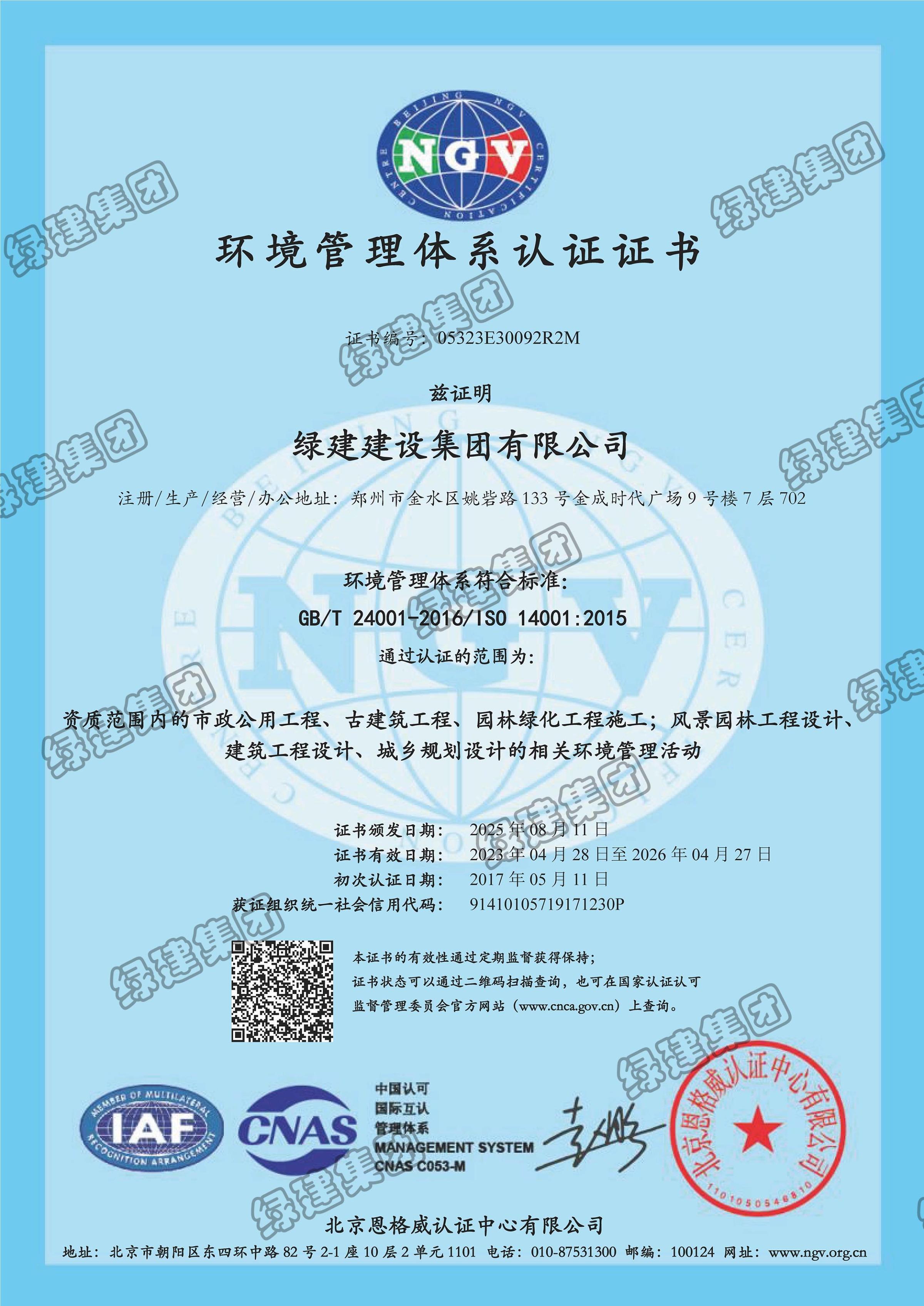 環境管理體系認證證書